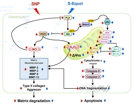 Schematic of S-Equol protects chondrocyte against SNP’s damage. Treatment of chondrocyte with SNP could increase p53, intracellular NO and H2O2 levels and decrease mitochondrial membrane potential (ΔΨM). Furthermore, the NO could activate MMPs, resulting in type II collagen and aggrecan degradation. Simultaneously, p53 could increase expressions of pro-apopototic proteins including BIM, PUMA, NOXA, BAX, and BAK, and cause a decrease in anti-apoptotic proteins including Bcl-XL and Bcl-2 expression, resulting in the release of cytochrome c, activation of caspase-9 and caspase-3, and finally the induction of apoptosis. The addition of S-Equol could lessen those effects caused by SNP. Moreover, S-Equol could active the PI3K/Akt pathway, an upstream of apoptosis and NO production, including an increase in phosphorylation of Akt and Mdm2 to inhibit p53 and NO production, by which the apoptosis and matrix degradation caused by SNP are decreased. Red