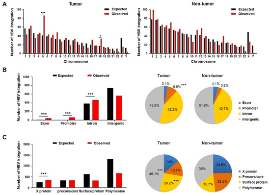 Figure 1A shows HBV integration breakpoints distributed across the entire human genome. HBV was preferentially integrated into chromosomes 5 and 18 (all p < 0.05) in tumors, as compared to the expected result. Although not statistically significant, there were preferential integrations of HBV into genic regions (defined as the combination of promoters (5 kb upstream of transcription start site), exons (including 3′-untranslated region) and introns) in tumors but not non-tumor tissues (54.2% (213/393) vs. 48.4% (358/740), respectively; p = 0.062). In particular, there was specific enrichment of HBV integrations into the promoter region of genes in tumors versus non-tumor tissues (Figure 1B). The enrichments of HBV integration might be associated with recurrent integrations into TERT, MLL4, or other sites. Notably, despite the fewer tumoral integration breakpoints (Figure 2A), the absolute number of HBV-promoter integrations was higher in tumors than in adjacent non-tumor tissues (8.9% (35/393) vs. 3.6% (27/740), respectively; p < 0.001). For the HBV genome, integration was more frequently found in the HBx (X protein), but less frequently found in the polymerase as compared to the expected frequencies (Figure 1C). HBV integration into the preS/S region (surface protein) was more frequently observed in tumors versus non-tumor tissues (p < 0.001).