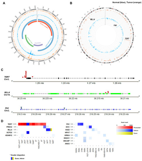 - Ferber, M.J.; Montoya, D.P.; Yu, C.; Aderca, I.; McGee, A.; Thorland, E.C.; Nagorney, D.M.; Gostout, B.S.; Burgart, L.J.; Boix, L.; et al. Integrations of the hepatitis B virus (HBV) and human papillomavirus (HPV) into the human telomerase reverse transcriptase (hTERT) gene in liver and cervical cancers. Oncogene 2003, 22, 3813–3820. [Google Scholar] [CrossRef] [Green Version]