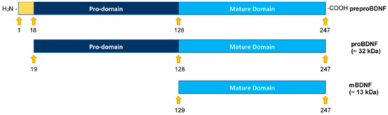 Structural representation of preproBDNF, proBDNF, and mature BDNF (mBDNF). Formation of mBDNF occurs upon cleavage of the N-terminus of proBDNF. The signal peptide (18 amino acids, positions 1–18) is shown in yellow, the propeptide (110 amino acids, positions 19–128) is shown in dark blue, and mBDNF (119 amino acids, positions 129–247) is shown in light blue.