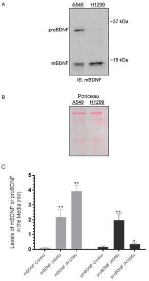 The levels of proBDNF are higher in the media of A549 cells than in the media of H1299 cells. Cells (0.2 × 105) were grown in 10% FBS-supplemented media for 24 h in 25 cm2 flasks. The following day, the cell monolayers were incubated at 37 °C in serum-free media for 72 h. The same concentration of total protein (15 µL of 600 µg/mL) of the media (A) was used for Western blotting using the indicated antibody (IB: mBDNF). Total protein (Ponceau staining) (B) served as a loading control. The levels of mBDNF and proBDNF were quantitated as described in the Methods Section (C). Data from five independent assays, each carried out in triplicate, were quantitated and averaged using the GraphPad 9.0.2 software. The graph summarizes the results expressed as means ± SD (n = 5). Asterisks (*) indicate a statistically significant difference from the corresponding mBDNF or proBDNF control that included all components but using media not incubated with cells (C). * p < 0.05, ** p < 0.01, Mann–Whitney test.