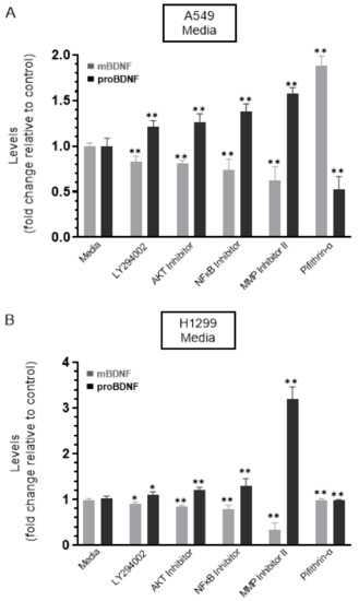 Cells were grown in 10% FBS-supplemented media for 24 h. The following day, the cell monolayers were incubated in serum-free media for 24 h and then treated as indicated for 72 h with the inhibitors, as described in the Methods Section and as we recently reported [44]. The media were collected, and then the same amount of protein of each sample was used to quantitate mBDNF and proBDNF (Methods). In the media of both cell lines, there was an increase in the levels of proBDNF and a decrease in the levels of mBDNF upon cell treatment with the PI3K inhibitor, AKT inhibitor, and NFκB inhibitor (Figure 3) suggesting that these proteins are likely involved in the mechanism regulating the ratio of proBDNF/mBDNF in the media of A549 and H1299 cells. Of all the inhibitors examined, treatment with the MMP2/9 inhibitor resulted in the largest increase in proBDNF levels and corresponded with the greatest decrease in the levels of mBDNF in the media of both A549 and H1299 cells (Figure 3). Moreover, a larger fold increase in proBDNF levels, ~3.2-fold, was observed in the media of H1299 cells treated with the MMP2/9 inhibitor as compared to that observed in the media of A549 cells, ~1.6-fold. These results might be indicative of the presence of more mBDNF in H1299 cell media that becomes less pronounced by MMP2/9 inhibition.