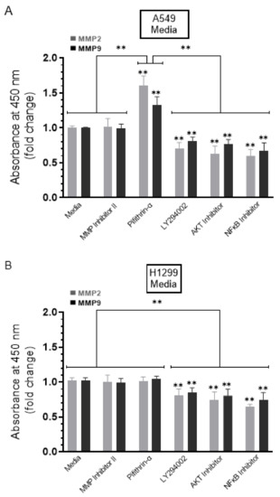 We, therefore, evaluated the levels of MMP2 and MMP9 in the conditioned media of A549 and H1299 cells in the absence or presence of treatment using the different inhibitors (Figure 4) (Methods). No change in the levels of MMP2/9 was detected in the presence of the MMP2/9 inhibitor in the media of either cell line (Figure 4). Increased levels of both MMP2 (~1.55-fold increase) and MMP9 (~1.25-fold increase) were detected in the media upon treatment of A549 cells (Figure 4A) with the p53 inhibitor, pifithrin-α, while there was no effect with this treatment on the levels of MMP2/9 in the media of the p53-null H1299 cells (Figure 4B). These results suggest that p53 functions to decrease MMP2/9 levels in the media of A549 cells. The levels of both MMP2 and MMP9 decreased in the media of both cell lines upon treatment of the cells with the PI3K inhibitor, AKT inhibitor, or NFκB inhibitor (Figure 4), suggesting that these proteins play a role in the mechanism regulating the levels of MMP2 and MMP9 in the media of A549 and H1299 cells.