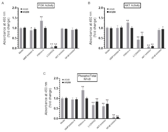 To test the effect of the inhibitors on the activity of PI3K, AKT, and NFκB, cells were treated with the inhibitors as indicated, and then the PI3K, AKT, and NFκB assays were performed as described in the Methods Section. A549 cell treatment with the p53 inhibitor, pifithrin-α, resulted in a ~1.30-fold increase in the activities of PI3K and AKT (Figure 5A,B). No effects were found when H1299 cells were treated with pifithrin-α (Figure 5A,B), which is not surprising since they are p53-negative [34]. These results might indicate downregulation of PI3K and AKT activities by p53 in A549 cells.