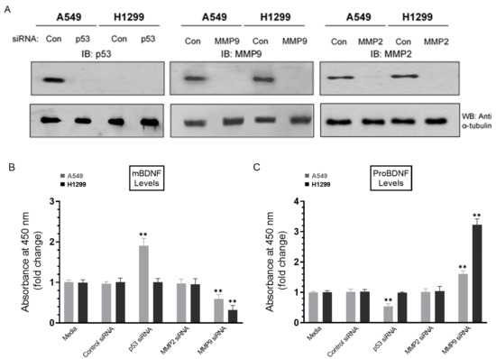 Cells were grown in 10% FBS-supplemented media for 24 h and then incubated in serum-free media for 24 h, followed by treatment for 72 h with the indicated siRNAs as described in the Methods Section (Figure 6). Treatment of A549 cells with p53 siRNA led to ~2.0-fold increase in mBDNF levels (Figure 6B) and ~1.85-fold decrease in the levels of proBDNF (Figure 6C) relative to cells transfected with control siRNA. This decrease was comparable to that observed upon inhibition of p53 using pifithrin-α (Figure 3A), suggesting that the function of p53 is important for regulating the levels of proBDNF and mBDNF in A549 cell media. No effects were detected on the levels of either proBDNF or mBDNF in H1299 cells transfected with p53 siRNA (Figure 6), giving results consistent with the lack of p53 in H1299 cells. Compared to p53 transfections, opposite effects were observed on the levels of mBDNF and proBDNF upon cell treatment with MMP9 siRNA (Figure 6B,C). Transfection of A549 cells with MMP9 siRNA resulted in ~1.65-fold change in the levels of proBDNF and mBDNF, while a greater fold change, ~3.15-fold, was observed upon transfection of H1299 cells with MMP9 siRNA (Figure 6). No effects were observed upon transfection of either cell line with MMP2 siRNA (Figure 6). These results clearly highlight the importance of MMP9 in regulating the proBDNF and mBDNF levels in lung cancer cell media.