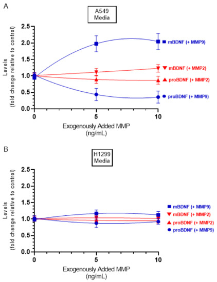 In this study, the levels of MMP2/9 were quantitated as described in the Methods Section and found to be ~3 ng/mL and ~5 ng/mL in the media of A549 and H1299 cells, respectively. To examine whether increasing concentrations of exogenously added MMP2 or MMP9 alters the ratio of mBDNF/proBDNF, active MMP enzymes were added at the indicated concentrations (Figure 7), and then the levels of mBDNF and proBDNF were quantitated (Methods). Exogenously added MMP9 enzyme at a concentration of 5 ng/mL to A549 cell media, resulted in ~2.00-fold increase in the levels of mBDNF with a concomitant decrease in the levels of proBDNF. No more apparent increase was found upon addition of 10 ng/mL protein possibly indicating efficient proteolysis of proBDNF to form mBDNF. Incubation with exogenously added active MMP2 enzyme had a relatively smaller effect possibly suggesting the lack of efficient proBDNF to mBDNF conversion by MMP2. While the trends were similar using H1299 cell media, the effects were almost negligible compared to those found using A549 cells, an observation that might be due to the relatively lower levels of proBDNF in H1299 cell media (Figure 2).