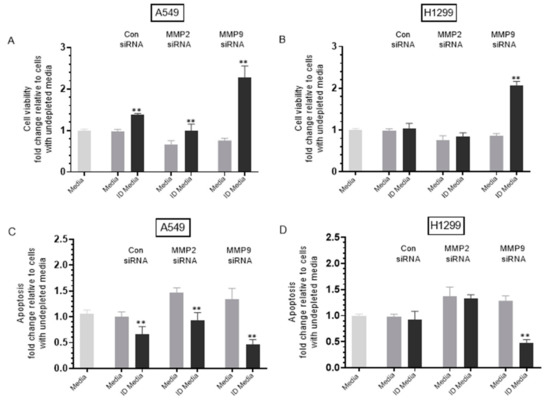 Treatment of either A549 or H1299 cells with MMP9 siRNA decreased cell viability and increased apoptosis, an effect reduced upon treatment with proBDNF immunodepleted (ID) media. ProBDNF immunodepleted media (ID) was prepared by growing cells (0.2 × 105) in 10% FBS-supplemented media for 24 h. The cells were then incubated in serum-free media overnight then with the indicated treatments for 72 h. The media were then collected and depleted from proBDNF using anti-proBDNF specific antibodies (Methods). Viability (A,B) and apoptosis (C,D) of A549 and H1299 cells were assessed as described in the Methods Section. In brief, cells were seeded in 96-well plates at 0.2 × 105 cells per well in 10% FBS-supplemented media. The next day, the cell monolayers were incubated in serum-free media for 12 h, then treated with 300 μL of the control and proBDNF ID media (0.5 μg/μL) for 72 h with the media containing the specific components in the various treatments replaced every 12 h. Data were processed using the GraphPad 9.0.2 software. The graphs summarize the results expressed as means ± SD (n = 3) of three separate experiments, each performed in triplicate. Asterisks (*) indicate a statistically significant difference between each treatment relative to nondepleted samples, ** p < 0.01. Absence of asterisks indicates no significance, Mann–Whitney test.