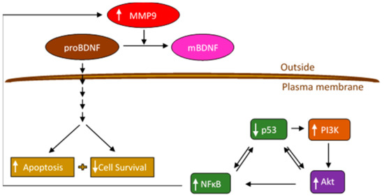 All the neurotrophins are synthesized as proneurotrophin precursor forms including proBDNF, the precursor of BDNF [10]. Both BDNF and proBDNF are secreted with opposite functions on cell proliferation and apoptosis [6,8]. ProBDNF may be secreted extracellularly and cleaved by proteases such as matrix metallopeptidase 9 (MMP9) or cleaved intracellularly to yield C-terminal mature BDNF (mBDNF) (Figure 1) [3,8,10]. According to the literature, proneurotrophins are thought to trigger cell death whereas mature neurotrophins promote cell survival [9]. Unlike Trk receptors, p75NTR, the high affinity receptor for proneurotrophins, expressed in a wide range of human tumors, acts as a tumor suppressor and blocks cell proliferation and invasion in a variety of cancers, promoting good prognosis [9]. Using C6 glioma cells, proBDNF via p75NTR led to increased apoptosis and reduced cell growth while a decreased proBDNF/mBDNF ratio was found in high-grade glioma and correlated negatively with tumor grade [11].
