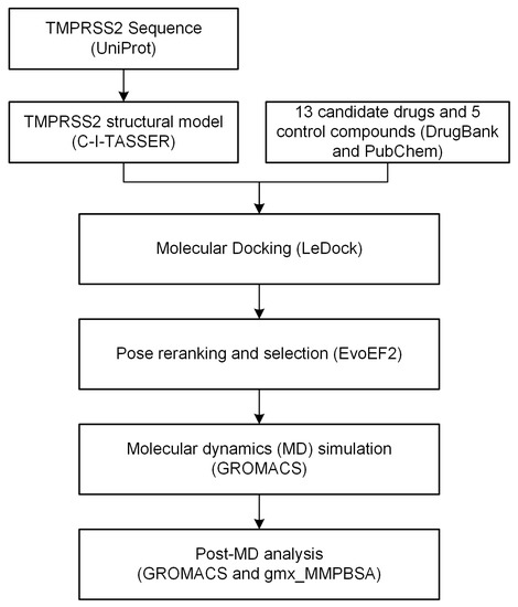 - Chikhale, R.V.; Gupta, V.K.; Eldesoky, G.E.; Wabaidur, S.M.; Patil, S.A.; Islam, M.A. Identification of potential anti-TMPRSS2 natural products through homology modelling, virtual screening and molecular dynamics simulation studies. J. Biomol. Struct. Dyn. 2020, 1–16. [Google Scholar] [CrossRef]
