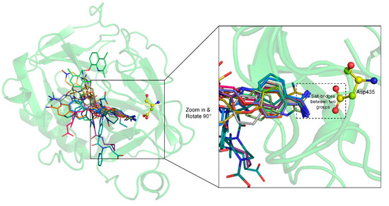 | DB05476 | Val280 (−0.61), His296 (−1.08), Asp435 (−2.98), Ser436 (−0.78), Cys437 (−1.44), Gln438 (−2.41), Gly439 (−0.89), Asp440 (−0.65), Ser441 (−1.45), Trp461 (−2.70), Gly462 (−0.97), Ser463 (−2.65), Gly464 (−1.91) |
