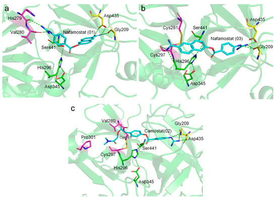 - Escalante, D.E.; Ferguson, D.M. Structural modeling and analysis of the SARS-CoV-2 cell entry inhibitor camostat bound to the trypsin-like protease TMPRSS2. Med. Chem. Res. 2021, 30, 399–409. [Google Scholar] [CrossRef] [PubMed]
