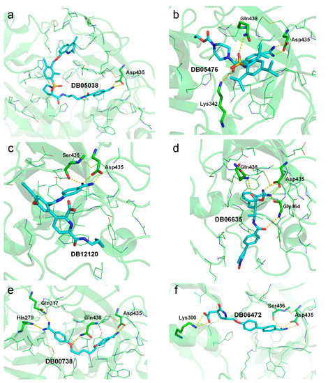 | DB12120 | Lys342 (−0.65), Tyr416 (−0.60), Asp435 (−1.93), Ser436 (−0.86), Cys437 (−1.82), Gln438 (−3.67), Thr459 (−0.58), Trp461 (−3.70), Gly462 (−2.26), Ser463 (−1.89), Gly464 (−0.53), Cys465 (−0.65) |
