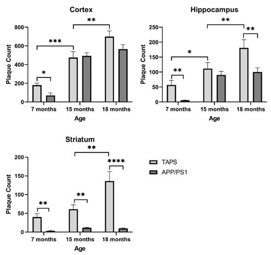 2.1. TAPS Mice Accumulate Aβ Aggregates in the Striatum, Hippocampus, and Cortex as Early as 6 Months