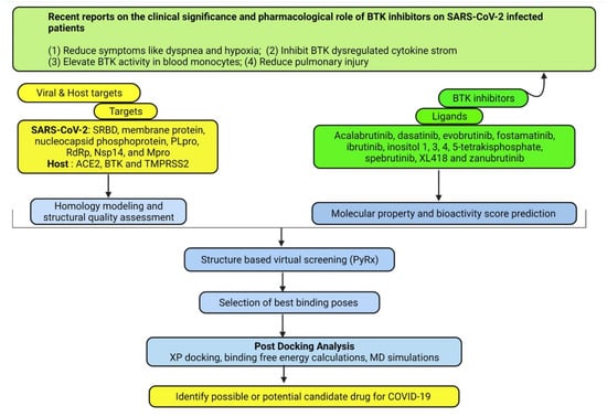 Drug development from scratch (lead identification and synthesis, pre-clinical and clinical research, FDA review, postmarket and drug safety monitoring) is a lengthy process which may not be the best suited to yield immediate solutions to the COVID-19 pandemic and related public health issues. On the other hand, drug repurposing is one of the effective emerging strategies to control COVID-19. During this pandemic situation, in silico approaches such as structure-based virtual screening (SBVS) and molecular dynamics (MD) simulations can be critical in identifying antiviral inhibitors against the dreadful COVID-19 [20,21,22,23]. Figure 1 illustrates the flow of the study: acalabrutinib, dasatinib, evobrutinib, fostamatinib, ibrutinib, inositol-tetrakisphosphate, spebrutinib, XL418 and zanubrutinib were selected as ligands and SARS-CoV-2 structural proteins including the spike receptor-binding domain (SRBD), the membrane protein, the nucleocapsid phosphoprotein, and nonstructural proteins (nsp) such as RNA-dependent RNA polymerase (RdRp), Nsp14, main protease (Mpro) and papain-like protease (PLpro) were selected as targets. The spike glycoprotein of SARS-CoV-2 binds with the host cell surface receptor angiotensin-converting enzyme 2 (ACE2), whereas transmembrane serine protease 2 (TMPRSS2) activates its membrane fusion. In addition, recent studies reported that BTK signaling dysregulation in lung macrophages might be a key pathophysiological component of SARS-CoV-2-induced lung injury [24,25]. Thus, ACE2, TMPRSS2 and BTK were also selected as drug targets for COVID-19. However, no computational study has been reported on the potential of BTK inhibitors against SARS-CoV-2. Therefore, integrated computational analysis (SBVS, MM/GBSA and MD simulations) was performed using nine ligands with seven viral targets and three host targets to find out possible candidate drugs against COVID-19.