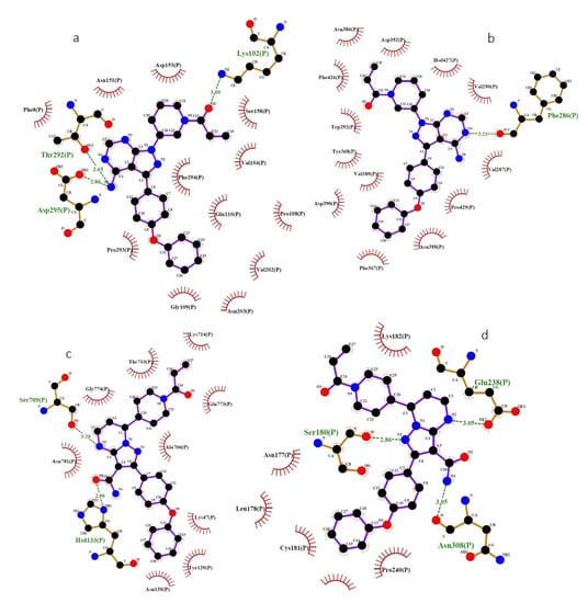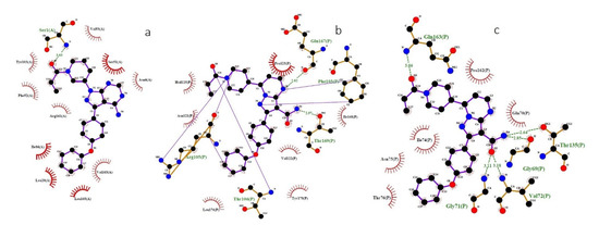 - Wallace, A.C.; Laskowski, R.A.; Thornton, J.M. LIGPLOT: A program to generate schematic diagrams of protein-ligand interactions. Protein Eng. 1995, 8, 127–134. [Google Scholar] [CrossRef]