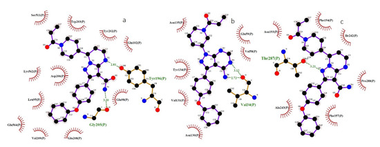 Binding interactions of ibrutinib and zanubrutinib and human proteins (ACE2, BTK and TMPRSS2) predicted by LigPlot. (a) Interaction of the OH and O atoms of TYR196 and GLY205 in the ACE2 and the N atom of zanubrutinib. (b) Interaction of the O atom of VAL34 in BTK and the N atom of ibrutinib. (c) Interaction of the OG1 atom of THR287 in TMPRSS2 and the N atom of zanubrutinib. ACE2—angiotensin-converting enzyme 2; BTK—Bruton’s tyrosine kinase; TMPRSS2—transmembrane serine protease 2; O—oxygen; N—nitrogen; blue lines—ligand bonds; orange lines—non-ligand bonds; dotted lines—hydrogen bonds and their length; red semicircles—non-ligand residues involved in hydrophobic contacts; black dots—corresponding atoms involved in hydrophobic contacts.