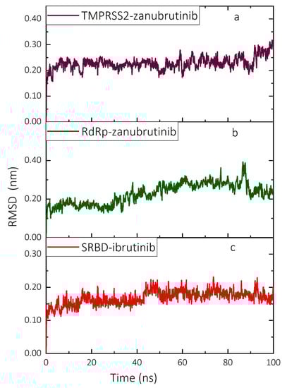 RMSD (nm) of atomic Cα positions for the complexes of targets (SRBD, RdRp and TMPRSS2) and ligands (ibrutinib and zanubrutinib) over the 100-ns timescale of MD simulations performed with NAMD. (a) TMPRSS2–zanubrutinib complex, (b) RdRp–zanubrutinib complex and (c) SRBD–ibrutinib complex. SRBD—spike protein receptor-binding domain; RdRp—RNA-dependent RNA polymerase; TMPRSS2—transmembrane serine protease 2; RMSD—root-mean-square deviation.
