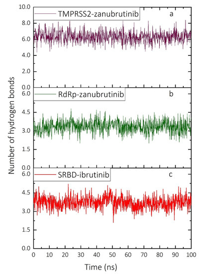 Number of intermolecular HB interactions in the complexes of targets (SRBD, RdRp and TMPRSS2) and ligands (ibrutinib and zanubrutinib) over the 100-ns timescale of MD simulations performed with NAMD. (a) TMPRSS2–zanubrutinib complex, (b) RdRp–zanubrutinib complex and (c) SRBD–ibrutinib complex. SRBD—spike protein receptor-binding domain; RdRp—RNA-dependent RNA polymerase; TMPRSS2—transmembrane serine protease 2; HB—hydrogen bond.