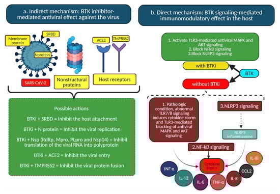 Schematic illustration of the possible mechanism of action of BTK inhibitors: a) direct mechanism of BTKi with BTK signaling-mediated immunomodulatory effect in the host; b) indirect mechanism with BTKi-mediated antiviral effect against SARS-CoV-2. ACE2—angiotensin converting enzyme 2; Akt—protein kinase B; BTKi—Bruton’s tyrosine kinase inhibitor; CCL2—chemokine ligand 2; IL—interleukin; IFN—interferon; MAPK—mitogen-activated protein kinase; NSP—nonstructural protein; NF-κB—nuclear factor-κB; NLRP3—NLR family pyrin domain-containing 3; SRBD—spike protein receptor-binding domain; TLR—toll-like receptors; TMPRSS2—transmembrane serine protease 2; TNF—tumor necrosis factor.