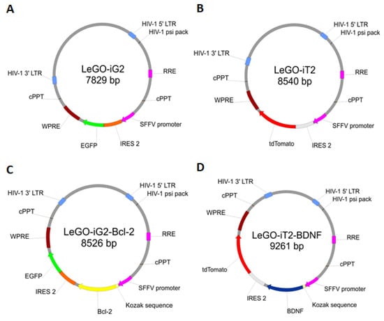 In order to achieve the overexpression of the two genes equally, the lentiviral constructs were prepared according to a previously published protocol []. Thanks to the cloning to the empty backbones, LeGO-iG2 (Figure 2A) and LeGO-iT2 (Figure 2B) coding sequence of BCL2 and BDNF genes, LeGO-iG2-Bcl-2 (Figure 2C) and LeGO-iT2-BDNF (Figure 2D), vectors were obtained that would induce overproduction of the Bcl-2 and BDNF proteins by the WJ-MSC. Additionally, in order to increase the functionality of that overexpression and increase the number of proteins that were produced in the vicinity of the START codon of each gene, the Kozak sequence was added.