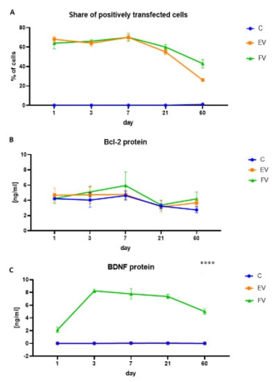 Transduction effects. Percentage of positive transduced cells over time (A). Quantitative analysis of the production of the Bcl-2 (B) and BDNF (C) proteins over time. Cells that were subjected to a synergistic vector transduction, which induced the overproduction of Bcl-2 and BDNF (full vectors—FV); empty vector transduced cells—(EV); control (C). In (C), the BDNF protein level of the EV group is the same as the C group (0 ng/mL all the time). The points represent the mean value (n = 6; three independent experiments). Statistically significant p < 0.05, **** p < 0.0001; two-way ANOVA test followed by a post hoc Tukey’s test.