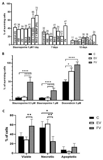 Cell survival analysis. Transduction using a single vector compared to the synergistic transduction of empty vectors (EV: iG2 + iT2) or full vectors (FV: BCL2 + BDNF). Cell death was induced one day (A, Left) or seven days (A, Right) after the transduction. The WST-1 assay was carried out one day after the staurosporine was added; ordinary one-way ANOVA test (A). Cell survival analysis after various death inducers were used. Cell death was induced 12 days after transduction. The WST-1 assay was carried out 1 day after each agent was added; ordinary, one-way ANOVA followed by a post hoc Tukey’s test (B). An examination of cell resistance to a toxic agent and an analysis of its type of death. Cell death was induced 12 days after transduction. The measurement was conducted 12 h after 1 µM of staurosporine was added; Kruskal–Wallis test followed by post hoc Dunn’s multiple comparison test (C). The points represent the mean value ± SD (n = 12; three independent experiments). Statistically significant * p < 0.05, ** p < 0.01 or **** p < 0.0001.