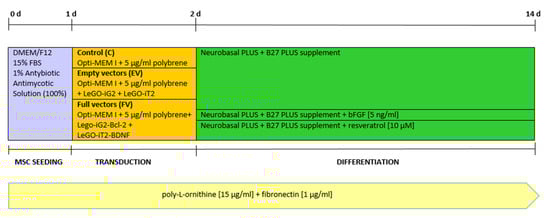 The assay was performed in 12-well plates with 50,000 cells seeded in each well. All of the differentiation procedures were carried out in poly-L-ornithine and fibronectin-coated vessels. Immediately after transduction, the transduction medium was changed to a differentiating medium. In order to induce neuronal differentiation, a medium containing Neurobasal PLUS (Gibco/Thermo Fisher Scientific, Waltham, MA, USA; A3582901) and B27 PLUS supplement (Gibco/Thermo Fisher Scientific, Waltham, MA, USA: A3582801) was used. For the WJ-MSC cells that had been transduced by the “full vectors”, the neuronal differentiation medium was additionally supplemented with bFGF (5 ng/mL) (Gibco/Thermo Fisher Scientific Waltham, MA, USA; PHG0264) or resveratrol (10 µM) (Sigma-Aldrich, Saint Louis, MO, USA; 554325). The differentiation protocol was carried out for 12 days (Figure 2).