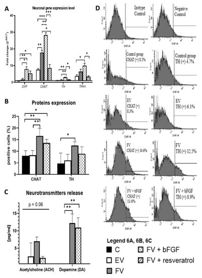 Differentiation effects. The RT-qPCR analysis for the neuronal markers is presented as the fold change (2−ΔΔCT) in the level of their expression, which was normalized to the RPS17 reference gene. Statistically significant * p < 0.05; ** p < 0.01 or *** p < 0.001, ordinary one-way ANOVA followed by a post hoc Tukey’s test (A). The number of CHAT and TH positive cells. Calculation based on a flow cytometry analysis, presented as a % of positive stained cells from the total cell numbers. Points represent the mean value ± SD (n = 9; three independent experiments). Statistically significant * p < 0.05; ** p < 0.01, ordinary one-way ANOVA followed by a post hoc Tukey’s test (B). Acetylcholine and dopamine release after depolarization using the neuronal differentiated WJ-MSC. The points represent the mean value (n = 6; three independent experiments). Statistically significant * p < 0.05 or ** p < 0.01, ordinary one-way ANOVA test (C). Flow cytometric analysis for the expression of the neural specific proteins: CHAT (choline acetyltransferase) and TH (tyrosine hydroxylase) after 12 days of differentiation. Figure 6D shows results from one exemplary sample from each of the study groups. The authors intention was to illustrate how the exemplary histograms appeared and where the cut-off site was. The percentage values represent the mean values (n = 9; three independent experiments) and are presented as a bar chart in part B of this figure (D). Control group (C), the group that had been transduced with the empty vectors (EV), the group of cells that had overproduced the Bcl-2 and BDNF proteins (FV), and the FV that had additionally been supplemented with bFGF or resveratrol.