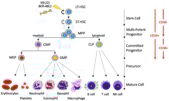 Simplified representation of the hematopoietic hierarchy. Hematopoiesis follows a hierarchical organization with hematopoietic stem cells (HSCs) on top and mature blood cells at the bottom. HSCs are the sources of various types of progenitor cells that proliferate extensively, forming more differentiated cells at the expense of their self-renewal capacity. The various types of precursor cells have been omitted, for simplicity (and this is denoted by dotted arrows instead of solid arrows). The driver lesion of CML, the t(9;22) chromosomal translocation giving rise to the BCR-ABL1 fusion gene, is gained at the HSC level. Abbreviations: LT-HSC: long-term hematopoietic stem cell; ST-HSC: short-term hematopoietic stem cell; MPP, multi-potent progenitor; CMP, common myeloid progenitor; CLP, common lymphoid progenitor; MEP, megakaryocyte-erythrocyte progenitor; GMP, granulocyte-monocyte progenitor.