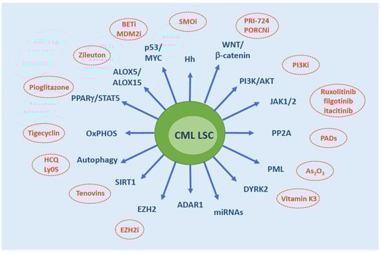 - Epigenetic alterations: Enhancer of Zeste Homolog 2 (EZH2) is a member of the Polycomb Repressive Complex 2 (PRC2) that trimethylates histone H3 at lysine 27 but may also directly regulate gene expression. It has been shown to be highly expressed in CML LSCs and to contribute to their survival [82]. Targeting histone deacetylases was also explored against CML LSCs, in light of the reported efficacy of such a strategy in inducing apoptosis in non-proliferating cells, and gave promising results when tested in combination with TKIs in cellular and mouse models [83]. Sirtuin 1 (SIRT1) deacetylase is a multifunctional protein that has several genes implicated in many cellular pathways, including energy metabolism and stress response, among its targets—including TP53 and FOXOs. SIRT1 has been shown to be overexpressed in CML LSCs and to contribute to LSC resistance to TKIs [84,85]. Later on, SIRT1 was found to mediate increased mitochondrial oxidative phosphorylation in CML [86], an important survival mechanism of LSCs [87]—see Section 5. The histone acetyltransferase CBP has also been implicated in LSC self-renewal, as opposed to p300 which rather promotes differentiation and senescence. Both can be recruited by b-catenin upon activation of the Wnt pathway. Inhibition of CBP was found to favor the formation of b-catenin/p300 complexes, switching the balance from cell proliferation to differentiation [88].
