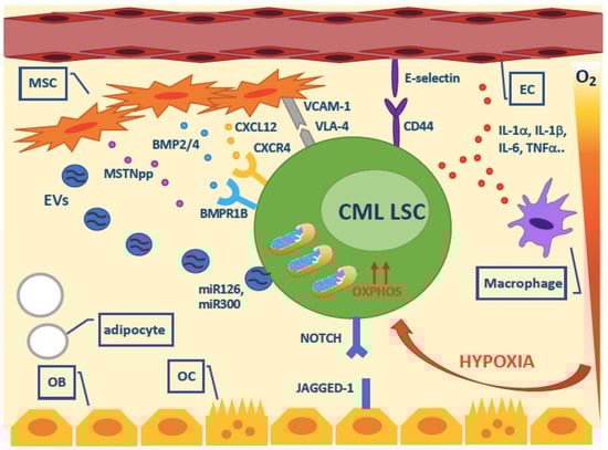 As anticipated, the BMM is thought to play a key influence on LSCs, and this is a general piece of knowledge that holds true not only in CML. The cross-talk between LSCs and BMM is mediated by (i) soluble or exosome-incapsulated factors and (ii) cell-cell direct interactions via surface molecules, and involves a broad array of cell types on the BM side, like mesenchymal stromal, endothelial, perivascular, osteolineage and immune cells. LSCs are known to coopt or hijack BM niches, that protect and nurture them at the expense of normal hematopoiesis. In the light of this complex interplay, it is believed that the study of the BM niches is at least as important as the study of LSCs, as a deep understanding of the role of BMM may provide important clues on how to selectively eliminate LSCs.