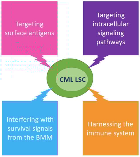 Over the past decade, additional, aberrant surface markers have been identified and validated that better discriminate between residual normal HSCs and CML LSCs. Needless to say that finding highly specific, robust and reproducible markers would hold an immense application potential, since this could improve diagnosis and facilitate isolation and biomolecular/functional characterization of LSCs. Additionally, beyond the already discussed prediction of response, it can be hypothesized that accurate estimation of LSCs may empower residual LSC tracking and quantitation during and after therapy, also as a predictor of TFR success. Last but not least, finding specific targets expressed on the surface of CML LSCs but not on normal HSCs or other cell types would enable highly selective therapeutic targeting of LSCs [34]. A variety of immunotherapy strategies, like cell-targeting antibodies, antibody-toxin conjugates, bispecific antibodies, and chimeric antigen receptor-engineered T (CAR-T) cell-based strategies may indeed be evaluated in an attempt to eradicate the disease, and these are likely to have fewer off target or toxic effects than inhibitors of pathway or players essential for LSC survival but often playing key roles also in normal cells.