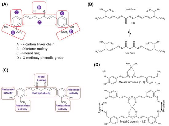 (A) The basic structure of curcumin. (B) Existence of curcumin in keto-enol tautomeric forms. (C) Groups of curcumin responsible for its biological properties. (D) Structure of 1:1 and 1:2 metal:curcumin complexes showing the β-diketone moiety of curcumin as the metal binding site.