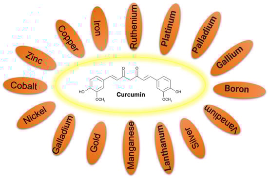 In recent decades, complexes of curcumin with various metals have been synthesized to overcome the issues associated with curcumin and to make it more biologically potent. Metals interact with the curcumin ligand, which brings a modification to curcumin’s overall structure and improves the biological efficacy of curcumin. It has been shown that the carbonyl group at the diketone moiety is destabilized due to the metal ion coordination [7]. Since metals are known as an enzyme coactivator, curcumin–metal complexes can interact with active sites of enzymes and induce multiple cellular processes. Although complexes of curcumin as nanoparticles, liposomes, micelles, and phospholipids have been developed that have shown improved biological efficacy [8], complexes of curcumin with transition metals may provide another approach to overcome the issues associated with curcumin.