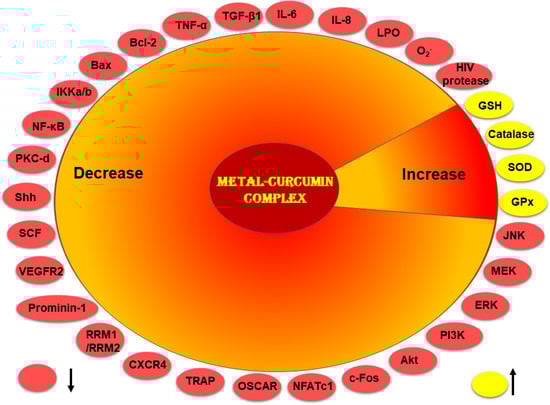 Curcumin–metal complexes show improved pharmacological effects compared to free curcumin [16]. These complexes have the ability to enhance antioxidant activity; inhibit inflammation; exert antimicrobial, antiviral, and anticancer effects; and exhibit neuroprotective and gastroprotective activities (Table 1). These activities have been mediated through the modulation of multiple molecular markers as shown in Figure 3.