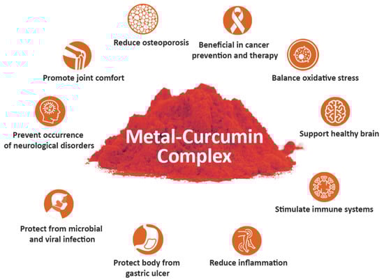 Metal–curcumin complexes demonstrated better antioxidant, anti-inflammatory, antimicrobial, and antiviral effects in preclinical and clinical studies compared to curcumin alone. The properties of metal–curcumin complexes have been manifested into multiple beneficial health effects (Figure 5). The preventive and therapeutic effects of metal–curcumin complexes against chronic inflammatory diseases are summarized in Table 2.