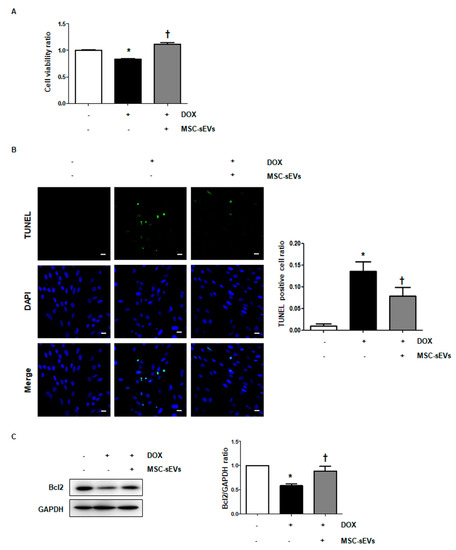 To determine the effects of MSC-sEVs on the DOX-induced apoptosis of cardiomyocytes, both cell viability and the level of apoptosis were measured. As is consistent with a previous study [22,23], treatment with DOX significantly reduced H9c2 cell viability. However, treatment with MSC-sEVs prior to DOX treatment restored the suppressed cell viability (Figure 1A). Similarly, the TUNEL assay showed that DOX treatment induced cellular apoptosis, whereas pretreatment with MSC-sEVs alleviated it (Figure 1B). In addition, we measured the protein level of Bcl-2, a representative anti-apoptotic protein. As shown in Figure 1C, Bcl-2 protein levels were lower in DOX-treated cells than in control cells, whereas stimulation with MSC-sEVs prior to DOX treatment enhanced the suppressed Bcl-2 expression by DOX. These results indicate that MSC-sEVs protect cardiomyocytes against DOX-induced cellular apoptosis.