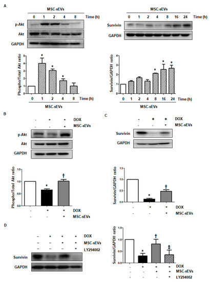MSC-sEVs inhibit DOX−induced downregulation of survivin via the activation of Akt in cardiomyocytes. (A) H9c2 cells were treated with MSC-sEVs (3 × 109) for the indicated times. The protein levels of p−Akt, Akt, survivin, and GAPDH were measured by Western blotting. * Significant difference compared to the control (p < 0.05). (B,C) H9c2 cells were cultured in DOX (1 μM) for 8 or 24 h after 24 h of exposure to MSC-sEVs. The protein levels of p−Akt, Akt, survivin, and GAPDH were measured by Western blotting (n = 5). * Significant difference compared to the control (p < 0.05). † Significant difference compared to DOX treatment (p < 0.05). (D) After treatment with LY294002 (50 μM) for 2 h, the cells were exposed to MSC-sEVs (3 × 109) for 24 h and then additionally treated with DOX (1 μM) for 24 h. The protein levels of survivin and GAPDH were measured by Western blotting (n = 5). * Significant difference compared to the control (p < 0.05). † Significant difference compared to DOX treatment (p < 0.05). ‡ Significant difference compared to MSC-sEVs + DOX treatment (p < 0.05).