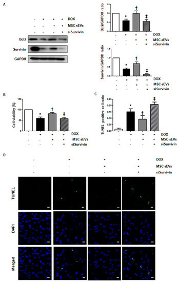 To clarify whether survivin induced by MSC-sEVs contributes to the anti-apoptotic effect on DOX-induced cell death in cardiomyocytes, survivin levels were suppressed by siRNA transfection in cardiomyocytes, and the effects of MSC-sEVs on DOX-treated cardiomyocytes were observed. Survivin was effectively suppressed by transfection of target siRNA (Figure A4). After siRNA transfection, H9c2 cells were exposed to MSC-sEVs for 24 h, followed by DOX treatment for another 24 h. As shown in Figure 3A, the level of recovered anti-apoptotic Bcl-2 by MSC-sEVs in DOX-treated cells decreased following the knockdown of survivin. Cell viability and apoptosis level were measured using the MTT and TUNEL assays, respectively. The results showed that the knockdown of survivin reversed the anti-apoptotic effects of MSC-sEVs in DOX-induced cell death; cell viability decreased, while cellular apoptosis increased (Figure 3B–D). These results suggest that survivin may be the major factor contributing to the anti-apoptotic effects of MSC-sEVs against DOX-induced cell death in cardiomyocytes.