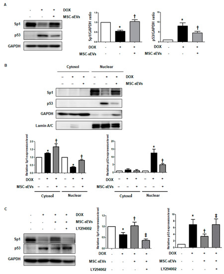 To identify the key transcription factors mediating survivin expression by MSC-sEVs, we tested Sp1 and p53, which regulate survivin expression under various stimuli [24]. The p53 expression is induced by DOX treatment in cardiomyocytes, whereas DOX inhibits Sp1 activation [24,25,26,27]. Based on these studies, we hypothesized that Akt activation by MSC-sEVs regulates both Sp1 and p53 and induces survivin expression. As is consistent with previous studies, the expression levels of both Sp1 and p53 changed in response to DOX treatment in H9c2 cells; Sp1 levels decreased and p53 levels increased following DOX treatment (Figure A5). Furthermore, we investigated whether MSC-sEVs treatment affects the activation of Sp1 and p53 in cardiomyocytes in DOX-treated cells. As shown in Figure 4A, cells exposed to MSC-sEVs reversed the activities of both Sp1 and p53, induced by DOX treatment in H9c2 cells; downregulated Sp1 by DOX significantly increased in cells treated with MSC-sEVs, while upregulated p53, following DOX treatment, decreased. Next, we performed cytosol/nuclear fractionation to determine whether nuclear activation of these two transcription factors is regulated under DOX-treated conditions. The downregulated nuclear translocation of Sp1 by DOX was recovered in cells treated with additional MSC-sEVs. Conversely, the increased nuclear translocation of p53 by DOX decreased after additional MSC-sEVs treatment (Figure 4B). Next, we determined whether the regulation of both Sp1 and p53 by MSC-sEVs is mediated by Akt activation. After treatment (or not) with LY294002 for 2 h, the cells were exposed to MSC-sEVs 24 h prior to DOX treatment. The activities of Sp1 and p53 were reversed in cells treated with additional MSC-sEVs, compared to DOX-treated cells. However, the effects of MSC-sEVs were alleviated in DOX-treated cells when Akt was inhibited by LY294002 (Figure 4C). These results suggest that Akt activation by MSC-sEVs treatment induces Sp1 and inhibits p53 activation, followed by upregulation of survivin expression in DOX-treated cardiomyocytes.