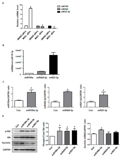 MSC exosomes have protective effects on pathogenic conditions via conveying various miRNAs to lesions [15,28]. Because we confirmed that MSC-sEVs alleviated apoptosis induced by DOX in cardiomyocytes, we hypothesized that some types of miRNAs in MSC-sEVs are responsible for the anti-apoptotic effects of MSC-sEVs. Based on previous studies, we selected three miRNAs (miR-199a-3p, miR-424-5p, and miR-21-5p) that are rich in MSC-sEVs and inhibit apoptosis in various cell types, and thus may play key roles in alleviating apoptosis in DOX-treated cardiomyocytes [15,29,30]. To identify whether those three miRNAs are indeed representative of MSC-sEVs compared to sEVs from other types of cells, we compared their levels between immortalized mouse aortic endothelial cells-derived small extracellular vesicles (iMAEC-sEVs) and MSC-sEVs. As shown in Figure 5A, miR-199a-3p levels were higher in MSC-sEVs than in iMAEC-sEVs, whereas the levels of miR-424-5p and miR-21-5p were lower. Next, we measured their levels in MSC-sEVs, which were normalized to the level of cel-miR-39-3p [31]. We found that miR-21-5p was the most abundant, followed by miR-424-5p and miR-199a-3p (Figure 5B). To explore the effects of these miRNAs on cardiomyocytes, we observed changes in the Akt/survivin pathway in H9c2 cells transfected with three individual miRNA mimics. Overexpression of each miRNA mimic significantly upregulated the miRNA level in H9c2 cells (Figure 5C). The levels of p-Akt were higher compared to controls when the three miRNA levels were upregulated individually. Furthermore, overexpression of miR-199a-3p increased the protein level of survivin, whereas overexpression of miR-424-5p and miR-21-5p did not (Figure 5D).