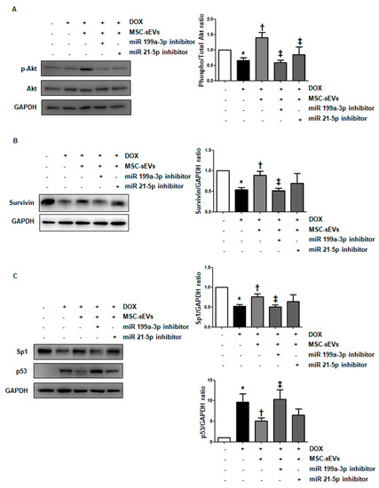 Inhibition of miR−199a−3p alleviates the effects of MSC-sEVs on the Akt−Sp1/p53−survivin axis in DOX−treated cardiomyocytes. For inhibition of miR−199a−3p and miR−21−5p, H9c2 cells were transfected with miRNA inhibitors (100 nM) targeting each miRNA. (A) After treatment with MSC-sEVs (3 × 109) for 1 h, cells were treated with DOX (1 μM) for 8 h. The protein levels of p−Akt, Akt, and GAPDH were measured by Western blotting (n = 5). (B,C) H9c2 cells transfected with miRNA inhibitors were pre−treated with MSC-sEVs (3 × 109) for 24 h, and then incubated with DOX (1 μM) for another 24 h. The protein levels of survivin, Sp1, p53, and GAPDH were measured by Western blotting (n = 5). * Significant difference compared to the control (p < 0.05). † Significant difference compared to DOX treatment (p < 0.05). ‡ Significant difference compared to MSC-sEVs + DOX treatment (p < 0.05).