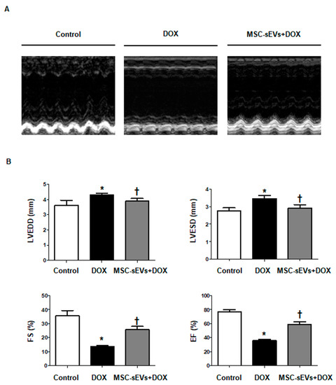 To explore the effects of MSC-sEVs on DOX-induced cardiomyopathy in vivo, we compared cardiac function among the control, DOX, and MSC-sEVs + DOX groups. The DOX group had significantly dilated LV chamber dimensions, and lower FS and EF than the control group, suggesting DOX-induced cardiomyopathy [32,33]. However, the MSC-sEVs + DOX group showed significantly improved LV function, as well as reduced LV chamber dimensions compared to the DOX group, similar to the control group (Figure 8, Table 1). As shown in Table 1, the MSC-sEVs + DOX group recovered both LV FS (%) and EF (%), which were decreased by DOX from 13.76 ± 0.5988 to 25.80 ± 2.191 (p = 0.0179) and from 35.78 ± 1.322 to 58.93 ± 3.722 (p = 0.0179), respectively.