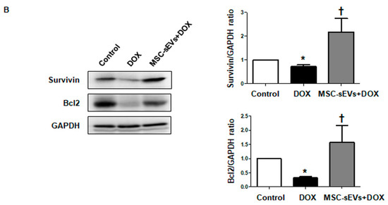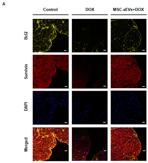 Finally, we confirmed that consistent MSC-sEVs administration in addition to DOX improved cardiac systolic function compared to the DOX-only treated group. For the in vivo study, we chose a short-term model with a single injection of DOX (15 mg/kg, intraperitoneally) [33,41,42] and MSC-sEVs were administered every other day for the experimental period for boosting. The preliminary results showed that the effects of MSC-sEVs lasted about 24 to 48 h in cardiomyocytes. Both immunohistochemical staining and Western blotting suggested that the DOX group had a lower expression of survivin and Bcl-2 than the control group. However, the MSC-sEVs + DOX group showed significantly higher levels of those proteins compared to the DOX group. These results demonstrate the anti-apoptotic effects of MSC-sEVs on DOX-induced cardiomyopathy.