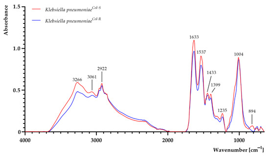FTIR spectra of colistin-susceptible (K. pneumoniaeCol-S) and laboratory-induced high-level colistin-resistant K. pneumoniae (K. pneumoniaeCol-R) strains.