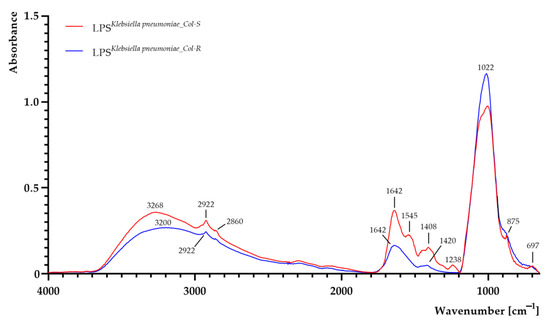 In order to confirm the presence of particular chemical moieties in K. pneumoniaeCol-S and K. pneumoniaeCol-R, as well as in their LPS, FTIR and Raman spectroscopic analyses, were performed [18]. After 18 h cultivation of each strain at 37 °C on Columbia agar with 5% sheep blood, bacterial colonies were harvested, transferred to an Eppendorf tube, and washed three times using saline. Then, the samples were centrifuged at 5000× g for 5 min and dried for 24 h at 37 °C. The FTIR spectra of dried bacterial cell samples and freeze-dried LPS were obtained at room temperature by an attenuated total reflection FTIR spectrometer (Perkin Elmer Spectrophotometer 100, Waltham, MA, USA). The samples (100 mg) were then scanned at a range between 650 cm−1 and 4000 cm−1 (64 scans and 1 cm−1 resolution). The obtained spectra were normalised, baseline corrected, and analysed using SPECTRUM software (v10, Perkin Elmer Spectrophotometer, Waltham, MA, USA).