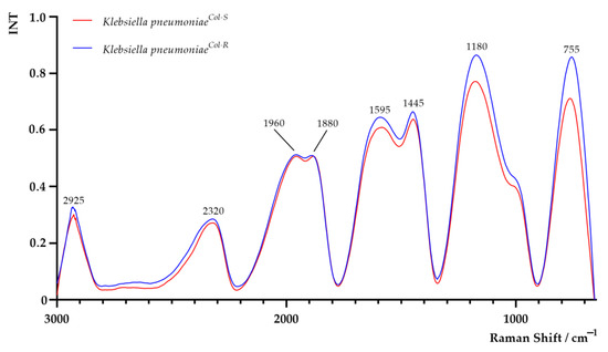 Raman spectra of colistin-susceptible (K. pneumoniaeCol-S) and laboratory-induced high-level colistin-resistant Klebsiella pneumoniae (K. pneumoniaeCol-R) strains.