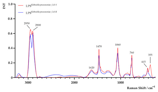 The Raman spectra of LPS extracted from both K. pneumoniaeCol-S and K. pneumoniaeCol-R are shown in Figure 5. Areas of all peaks are listed in Supplementary Table S1. In the Raman spectrum of LPSK. pneumoniae_Col-S sample, significant differences in peaks intensity at 1470 cm−1, 1060 cm−1 and 760 cm−1 and an additional peak at 355 cm−1 were observed. The obtained results suggest probable alterations in the LPS chemical composition, with special emphasis on CH2-deformation vibration, C–O–H and C–O–C vibrations and O–P–O stretching (from lipid and polysaccharide parts of LPS which may alter interactions of LPS hydrophobic groups with the surrounding) [38,39,40].