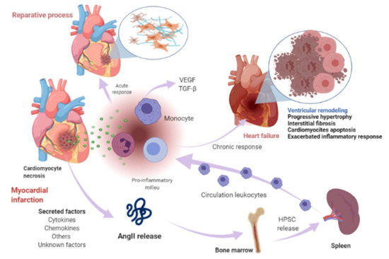 Myocardial infarction and heart-failure-related events. Shortly after myocardial injury, an increase in AngII concentration occurs and induces an accumulation, differentiation, and exit of hematopoietic stem/precursor cells (HPSC) from the bone marrow to contribute to splenic myelopoiesis to supply the infarcted area of the immune cells. Cardiomyocyte necrosis releases signals of danger and induces the secretion of cytokines, chemokines, and adhesion molecules to allow the recruitment and infiltration of leukocytes (mainly monocytes) into the infarcted area. Monocytes exert a reparative response, phagocytosing the cellular debris, while it stimulates repair pathways by secreting pro-inflammatory cytokines through the binding of angiotensin-II (AngII) to type 1 angiotensin-II receptor (AT1R), which induces the phosphorylation of nuclear factor-kappa B (NF-kB). This induces a pro-inflammatory response mediated by tumor necrosis factor-alpha (TNF-α) or interleukin-1 beta (IL1ß) and drives inflammation. The modulation of inflammation in this repair phase includes fibroblast activation and healing mediated in part by renin-angiotensin- aldosterone system (RAAS). When this response becomes chronic, it leads to a pathological process called ventricular remodeling, characterized by progressive hypertrophy of myocytes and interstitial fibrosis, which in later stages involve progressive loss of myocytes through apoptosis, an exacerbated inflammatory response. The healing and the adverse remodeling of the infarcted ventricle ultimately underlie heart failure. This environment can lead to the secretion of certain factors into the circulation that are synthesized in various cell types in the heart, including cardiomyocytes, fibroblasts, smooth muscle, and vascular endothelial cells and other unknown factors. Image created with BioRender.com (Toronto, ON, Canada).
