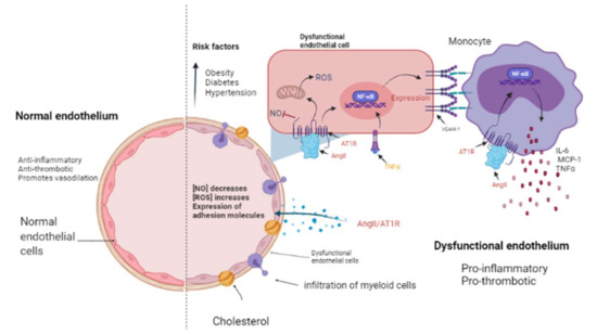 The endothelium in a normal and pathological state. The endothelium is a monolayer of cells that covers the interior of each major and minor vessel. A healthy endothelium has anti-inflammatory, anti-thrombotic properties and promotes vasodilation through nitric oxide (NO) release (left side). Cardiovascular risk factors such as obesity, diabetes and hypertension could promote a dysfunctional endothelium (right side) that is characterized by a decrease in NO release as well as an increment in reactive oxygen species (ROS) and a pro-inflammatory activity mediated by AngII/AT1R signaling, which activates NF-κB and, consequently, the expression of cytokines, chemokines, and adhesion molecules: interleukin-6 (IL-6), monocyte chemoattractant protein-1 (MCP-1), and vascular cell adhesion molecule-1 (VCAM-1) by endothelial cells. Then, myeloid cells such as monocytes migrate and infiltrate towards the aortic walls (where they become macrophages) contributing to the endothelial dysfunction by producing tumor necrosis factor-alpha (TNF-α), IL-6, and MCP-1. Image created with BioRender.com, Toronto, ON, Canada.
